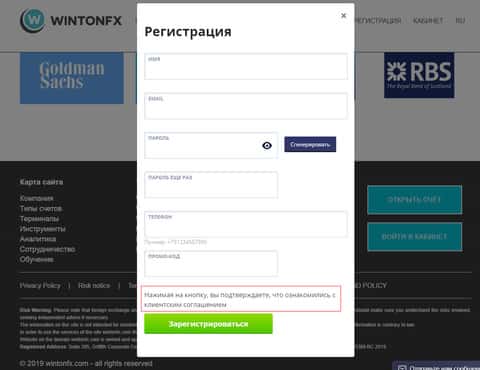 Доказательством этому является так же факт того, что при регистрации у аферистов WintonFX будет условие о том, что пользователь соглашается с клиентским соглашением мошенников Винтон ФХ фактом регистрации в данной помойке. К тому же и здесь нету никаких ссылок на условия сотрудничества лохотрона WintonFX, что уже определенно не является совпадением.