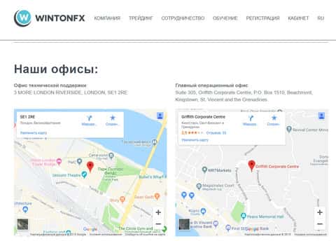 Под контакты аферисты Винтон ФХ не отводили отдельный раздел своего подвального сайта, вместо этого мошенники WintonFX попросту указали какие-то посторонние адреса и назвали их своими офисами, хотя никаких гарантий или доказательств их существования абсолютно нету. Ниже перечислим все известные контакты лохотрона Винтон ФХ с их сайта: