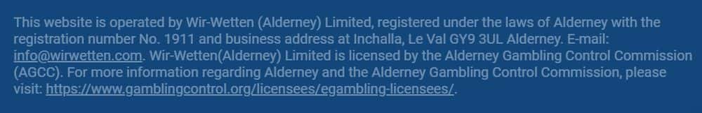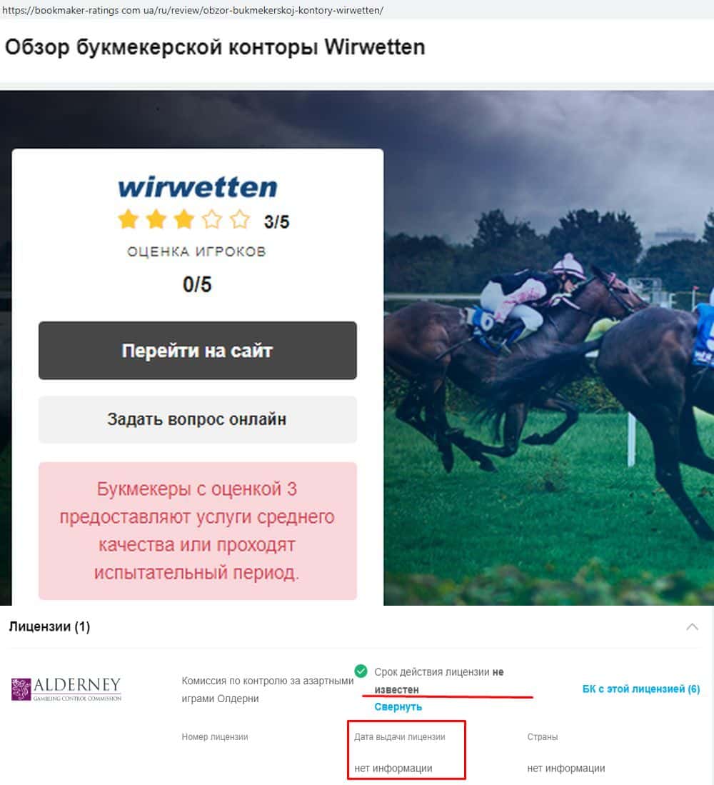 Вир Веттен - очередная гэмблинг-лоховозка, которая кидает игроков всеми возможными способами. Жулики не отвечают на запросы жертв, блокируют счета по выдуманным причинам, затягивают процедуру верификации и спокойно аннулирует невыгодные для себя ставки. У кидал нет регистрации, а лицензия выдана сомнительным недорегулятором Alderney (gamblingcontrol org). Не доверяйте мошенникам WirWetten деньги, а если уже завели, немедленно попытайтесь вывести.