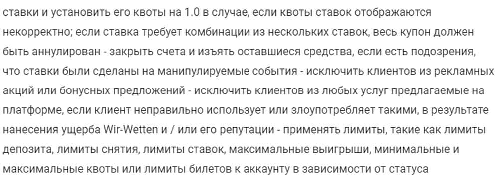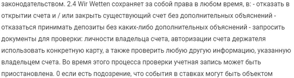 Жулики Вир Веттен без проблем могут исключать игроков из бонусных программ, применять лимиты, блокировать аккаунты, аннулировать ставки, достаточно заподозрить в жульничестве.