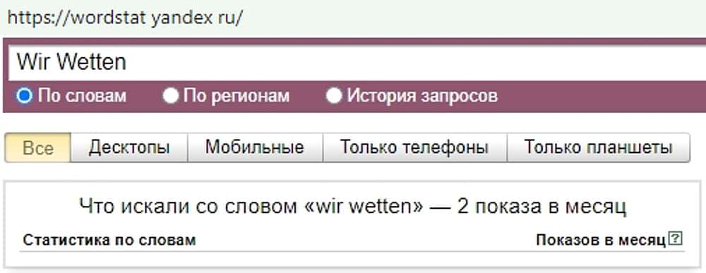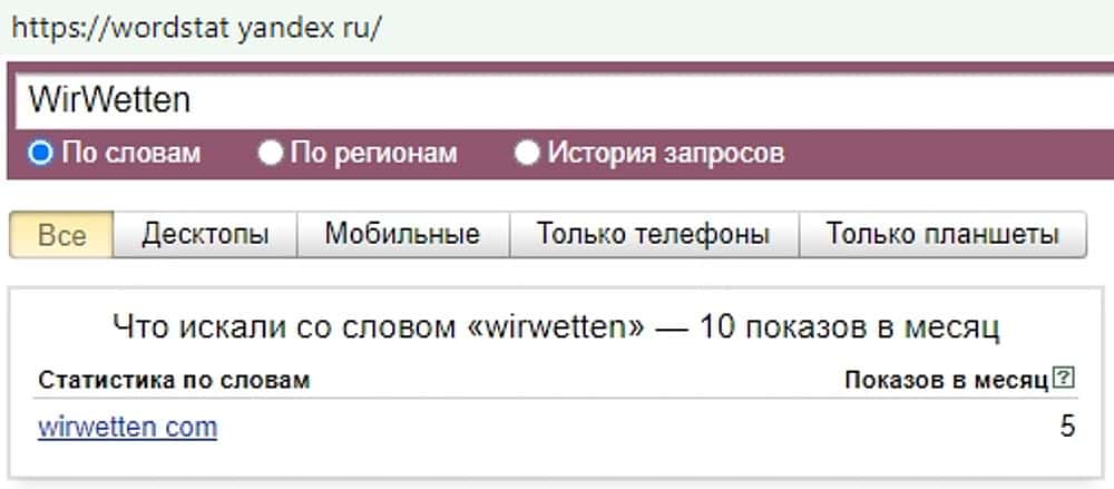 Еще меньшей популярностью пользуется написание бренда жуликов "Wir Wetten". Его и вовсе за целый месяц пытались искать всего 2 раза. Эта лохушня не востребована в Яндекс.