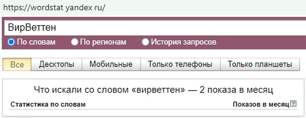 Фальшивую букмекерскую халабуду "ВирВеттен" также не желают особо находить юзеры, которые пользуются Яндексом. Всего 2 запроса поступило от них к серверам поисковой сети.