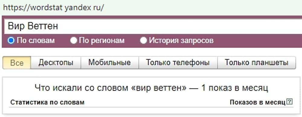 Вариант написания названия шарлатанства "Вир Веттен" использовался пользователями поисковой машины Yandex Ru 1 раз. У букмекерской помойки нет шансов стать популярной.