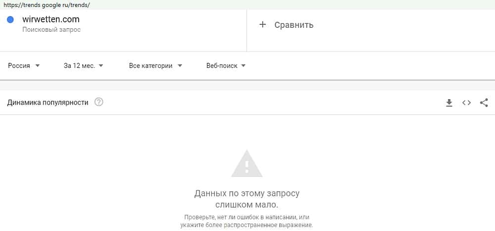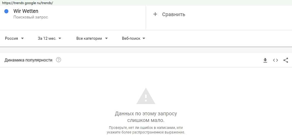 Ровно такая же востребованность, а именно нулевая, у поискового запроса "WirWetten". Никому не интересный псевдопроект не станет популярным с такой статистикой Гугл Трендс.