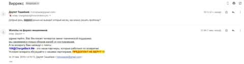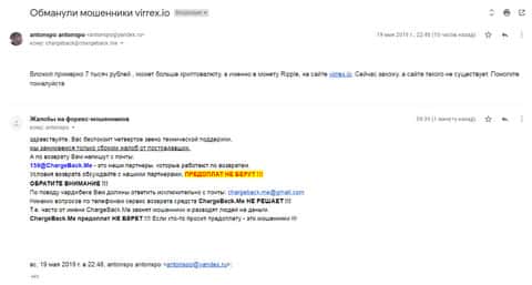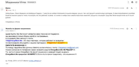 Еще одна жертва попала на крючок брокерской конторы Виррекс. Клиенту написали на почту с предложением заработать, на что человек и клюнул. В течение некоторого времени мошенникам удалось выманить у пострадавшего около 50000 рублей. После этого случая мужчина написал в компанию ChargeBack.Me как за последней помощью.