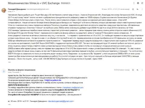 Далее представлена развернутая жалоба от пенсионера, который обратился в организацию ChargeBack.Me за помощью, так как его обворовали на сумму как минимум 2000 долларов. При чем в данной схеме замешаны две форекс-конторы - это Виррекс и UVC Exchange, которые работают в спаянной схеме развода.