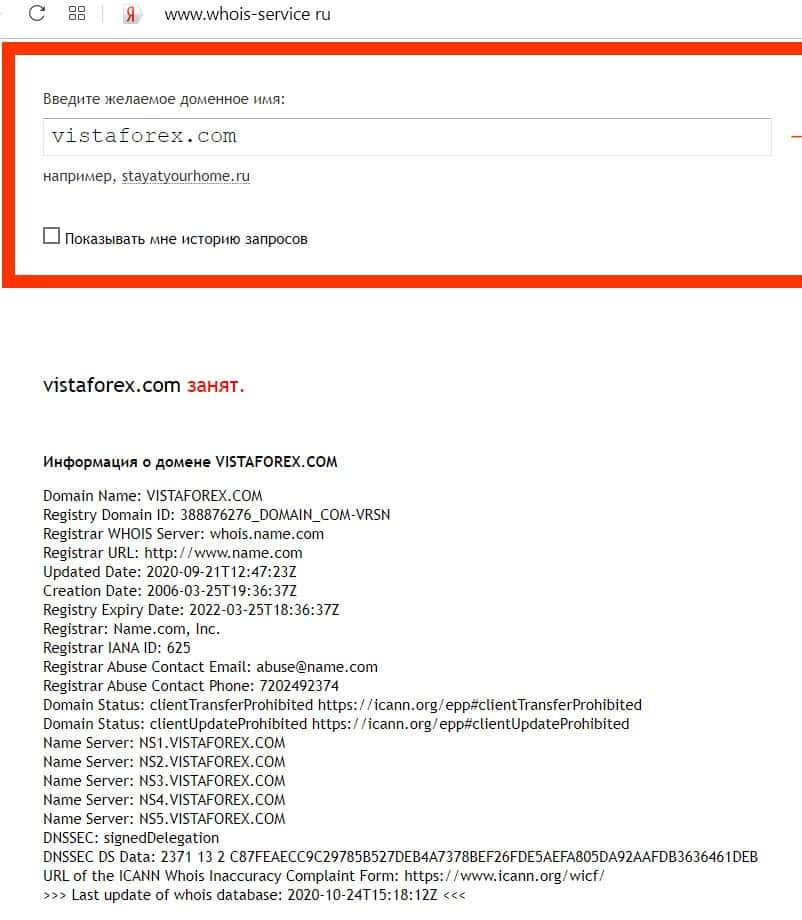 Кому принадлежит доменное имя сайта vistaforex com?