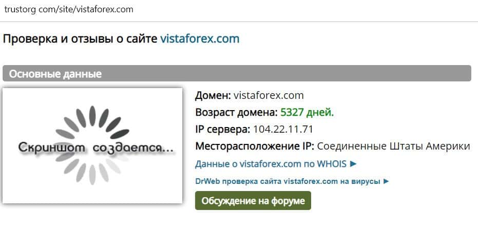 Показатели сайта лжеброкера VistaForex