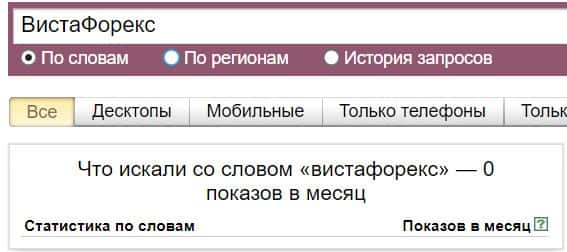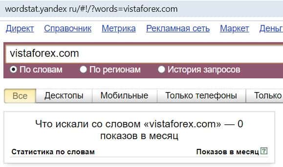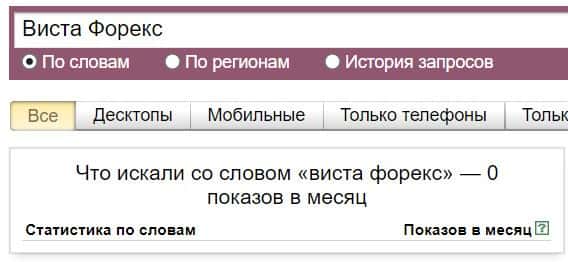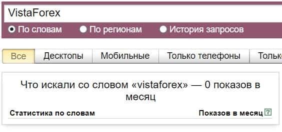 То же название "Vista Forex", но написанное с пробелом, люди не пытались найти в системе Яндекс ни разу.