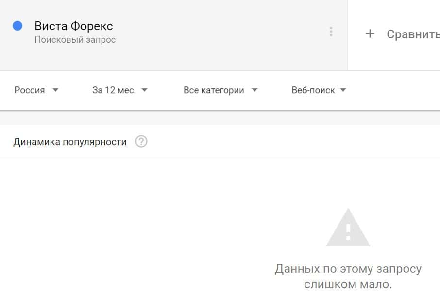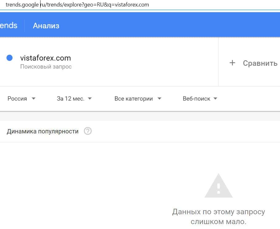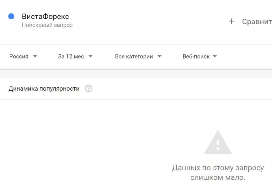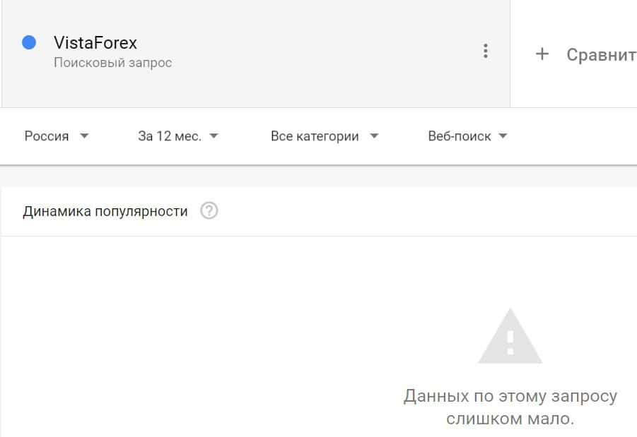 Посмотрим, насколько популярно название бренда "VistaForex", написанное на английском языке. Данных по этому запросу нет, так как никто не искал этот бренд в Гугл.