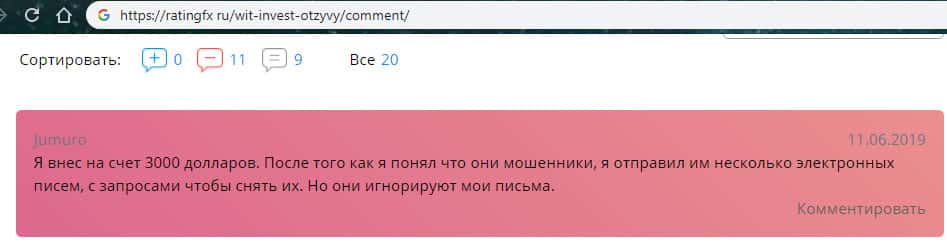 На ниже расположенном изображении вы можете увидеть очередной реальный негативный отзыв в сторону аферистов Wit Invest, который связан с тем, что мошенники довольно нагло развели еще одного пользователя сети, после чего попросту отказались выводить средства наивному клиенту и оставил очередного пользователя сети интернет с пустыми карманами.