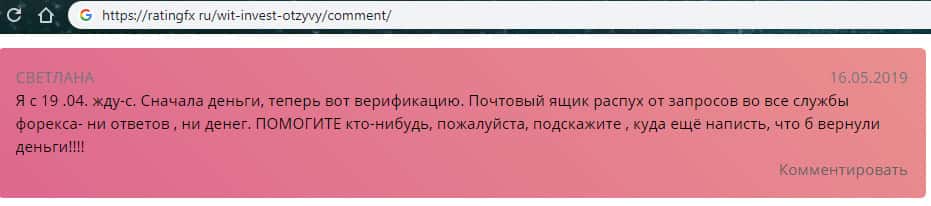 На изображении, расположенном ниже, вы можете наглядно увидеть и прочесть очередной реальный негативный отзыв в сторону аферистов Wit Invest, который связан с тем, что мошенники Вит Инвест попросту не выводят средства наивному пользователю сети и банально тянут время, дабы клиент забил на свои деньги, которые остались бы у шулеров Wit Invest.