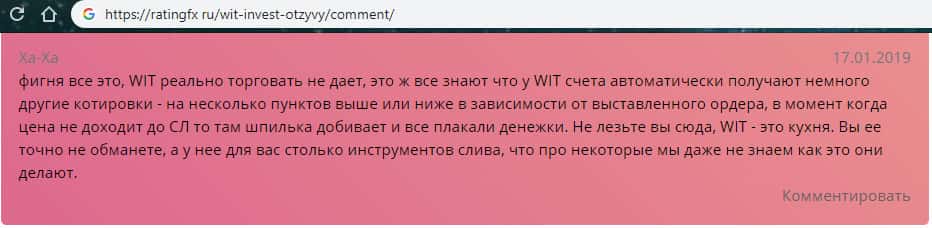 На изображении, расположенном ниже, вы можете наглядно увидеть очередной реальный негативный комментарий в сторону аферистов Wit Invest, который связан с тем что шулера Вит Инвест довольно типично слили счет еще одному пользователю, но уже с помощью своей подвальной конторы и кухонной платформы, которая крутила котировки не в сторону клиента.