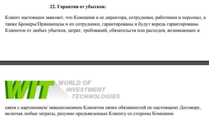 Завершаются же условия сотрудничества у аферистов Wit Invest вполне стандартно и ожидаемо, а именно тотальным отказом мошенников Вит Инвест от ответственности за возможные потери наивных пользователей в данной конторе и ее кухонной платформе. На изображении, расположенном ниже, вы можете увидеть окончание условий сотрудничества шулеров Wit Invest.