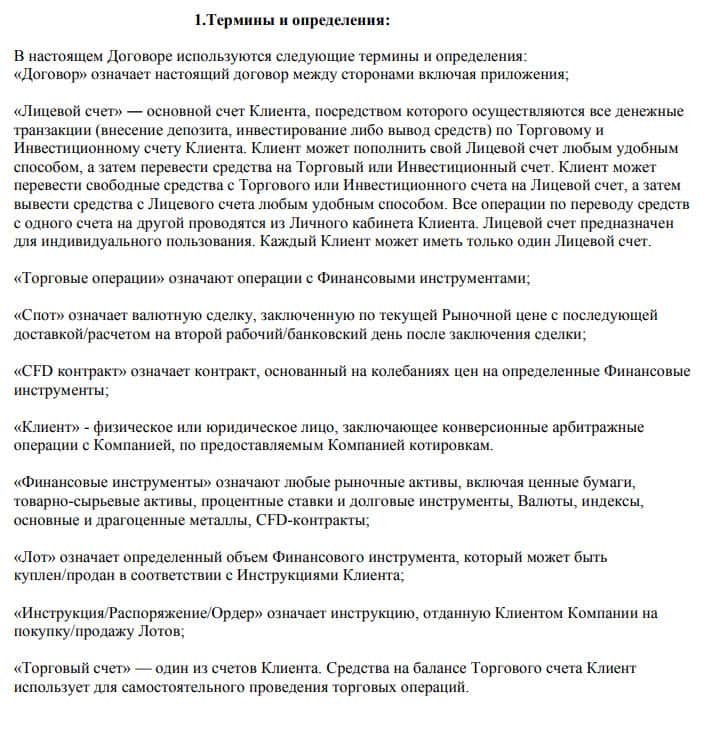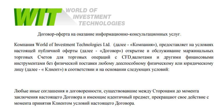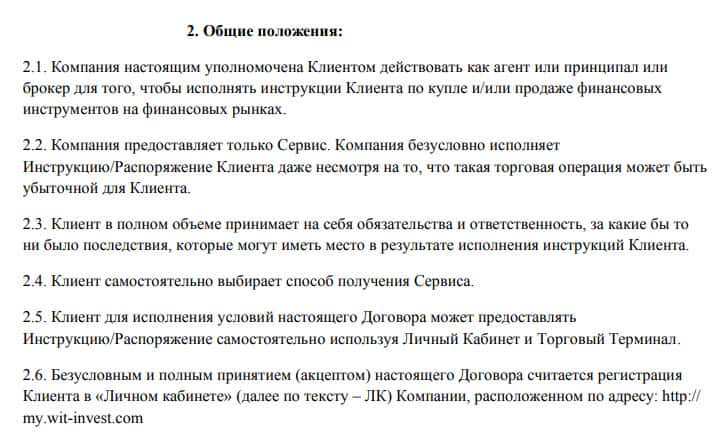Клиентское соглашение у аферистов Wit Invest начинается с типичной "воды" о том, что это за документ и зачем он нужен, которая вообще не несет в себе никакой информационной нагрузки и расположена здесь исключительно для виду. На изображении, расположенном ниже, вы можете наглядно увидеть начало клиентского соглашения мошенников Вит Инвест.