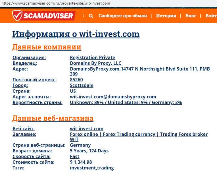 В связи с мошеннической и противозаконной деятельностью аферистов Wit Invest их реальные руководители предпочитают анонимность дабы избежать ответственности со стороны правоохранительных органов. Техническую информацию о самом сайте мошенников Вит Инвест можно узнать с помощью портала scamadviser com, который вы можете увидеть на изображении ниже.