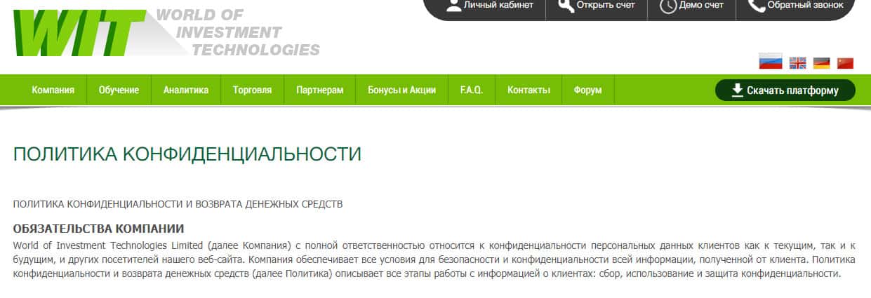 Политика конфиденциальности аферистов Вит Инвест, аналогично клиентскому соглашению, начинается со стандартной воды о том, что это за документ зачем он нужен и тому подобного, а так же условия о том, что мошенники Wit Invest собирают личную информацию клиентов. На изображении, расположенном ниже, вы можете увидеть начало политики аферистов Вит Инвест.