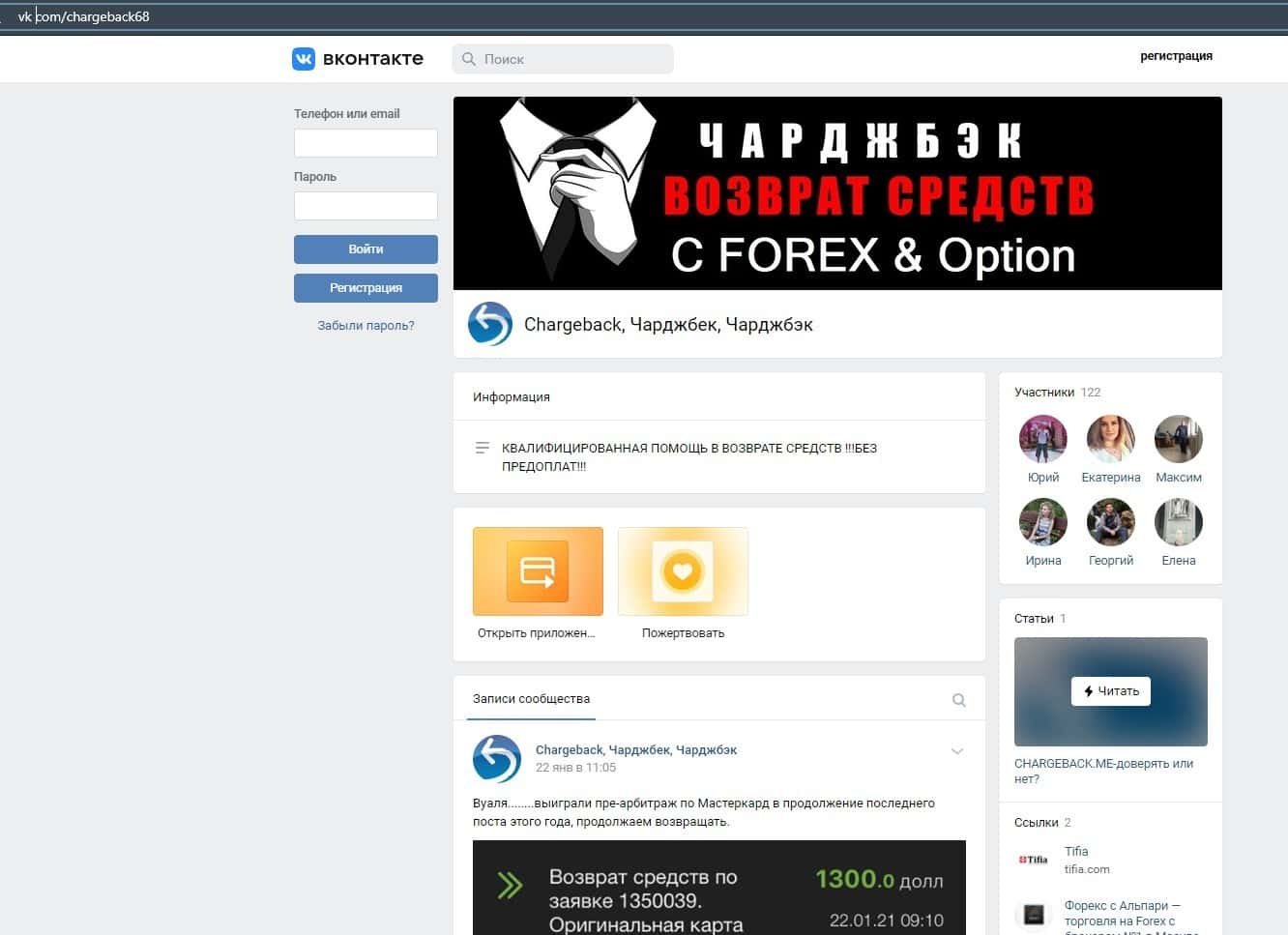 Далее представлена страничка группы конторы vk com/chargeback68, с помощью которой недобросовестные юристы привлекают кинутых жертв брокерами, чтобы обворовать их снова.