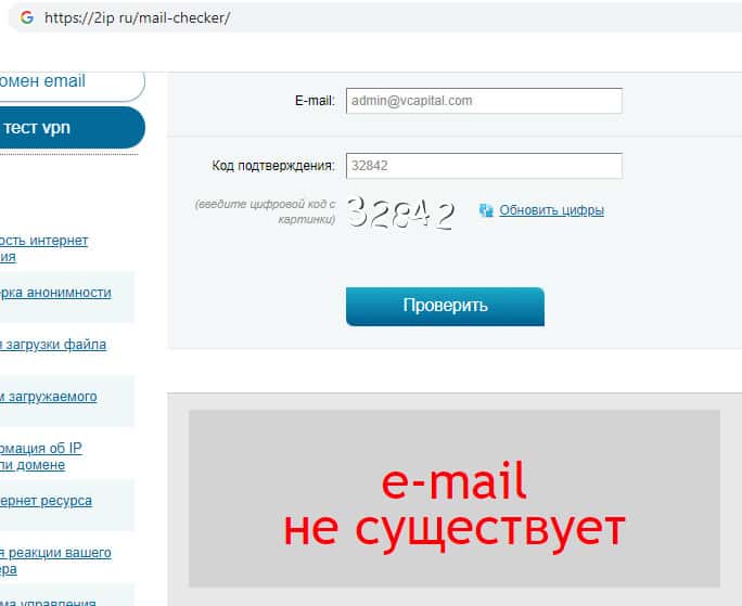 Мы проверили адрес электронной почты, который предоставила компания махинаторов ВКапитал. Оказалось, что почта не является активной, другими словами её нет, это просто фейк, обманка для пользователей, что бы ввести их в заблуждение и заставить писать на несуществующий адрес.