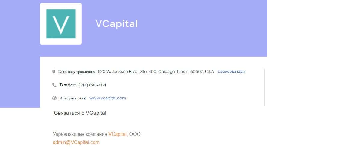 Так же компания мошенников предоставила адрес, по которому находится главный офис недоконторы ВКапитал. Жулики расположились по адресу: 901 W Jackson Blvd Suite 503 Chicago, Illinois 60607, US. Но судя по той информации, которую они предоставили выше, возникают сомнения по поводу существования офиса компании.