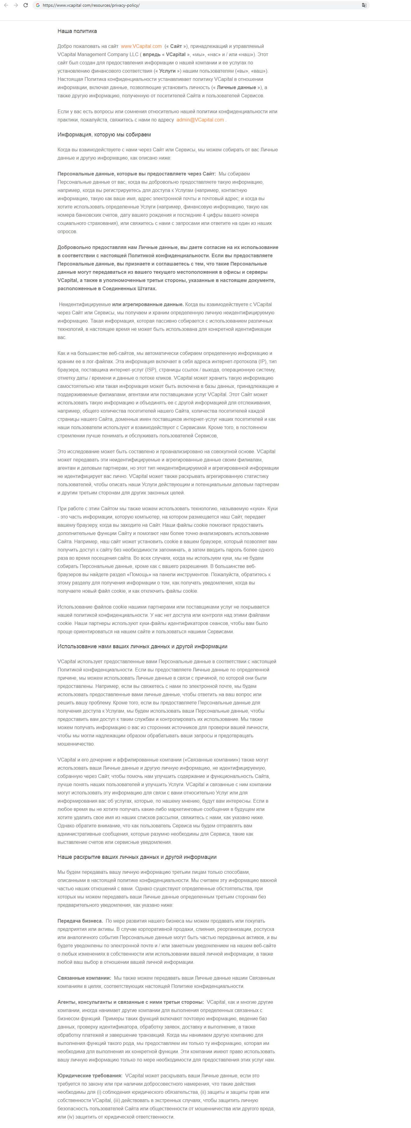 Жулики VCapital предоставили свою политику конфиденциальность, в которой лгут клиентам о том, что она конфиденциальна, и нет никакого доступа к ней, так же вся информация пользователей находится под защитой, что является ложью, так как всю информацию пользователей компания использует в своих нечистых целях.