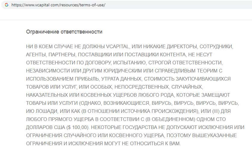 Мошенническая организация VCapital так же в одном из документов отказывается от ответственности. Хотя на самом сайте мошенники уверяют, что помогут, и будут консультировать, но на деле получается по другому, клиент теряет свои деньги, а аферисты отказываются от любой ответственности за это.