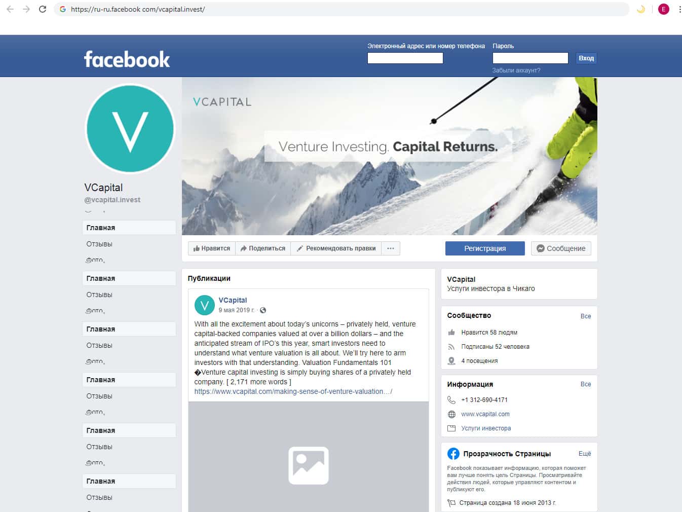 Так же нам удалось разыскать старую страницу в фейсбуке, которая так же принадлежит махинаторам ВКапитал. Там у них осталось чуть больше 50 подписчиков, почти все из которых являются сотрудниками компании, так как информация о мошенничестве быстро распространилась и почти все люди перестали интересоваться конторой.