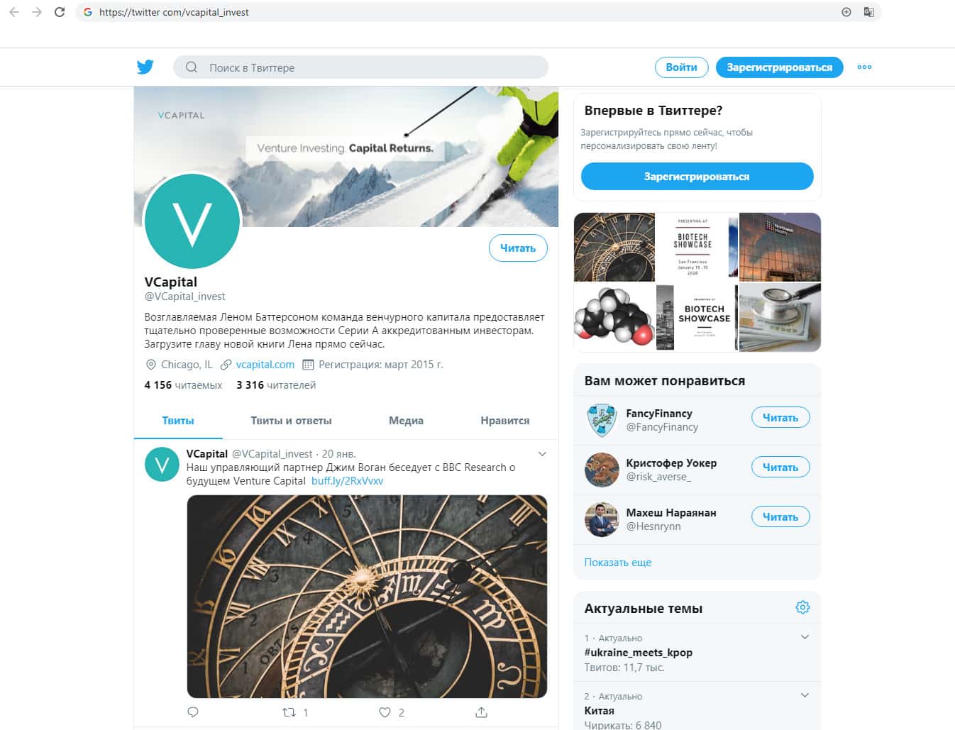Нам удалось найти аккаунт аферистов VCapital в твитере. Там их страница довольно актуальна, и набрала более 3 тысяч подписчиков, что довольно не малое количество. Но скорее всего компания просто их накрутила, что бы показать свою репутацию, якобы они нормальная известная фирма.