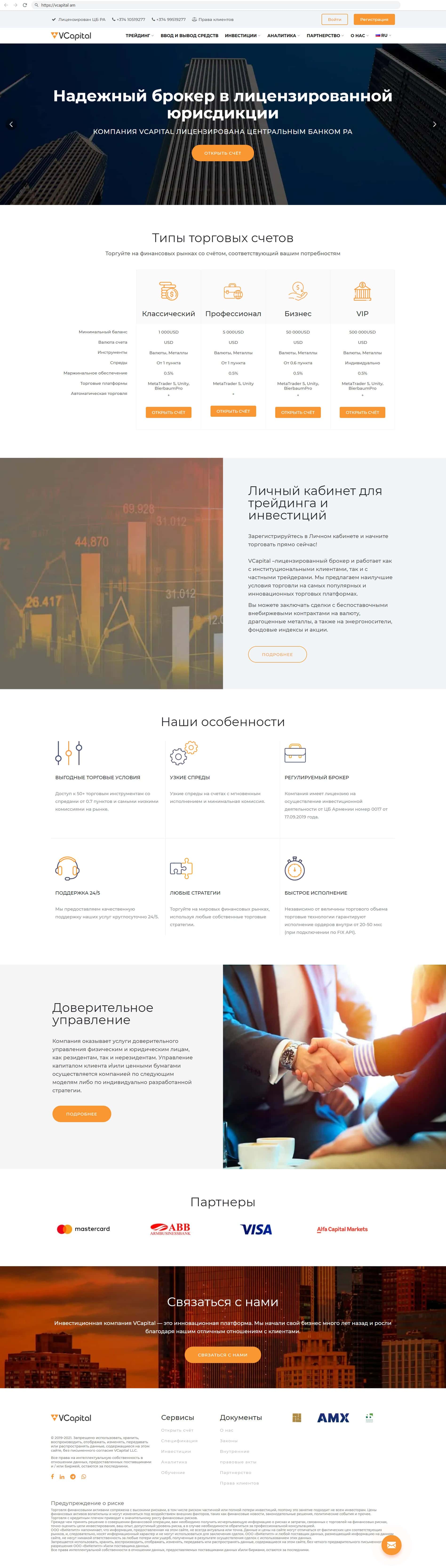 Главный интернет ресурс компании аферистов не представляет собой ничего большего чем простой коммерческий проект, который создан с целью завлечения клиентов в финансовую ловушку ВКапитал. Аферисты решили сэкономить деньги на сайте и не стали заморачиваться с ним, просто напичкали его громкими выражениями и лживой информацией.