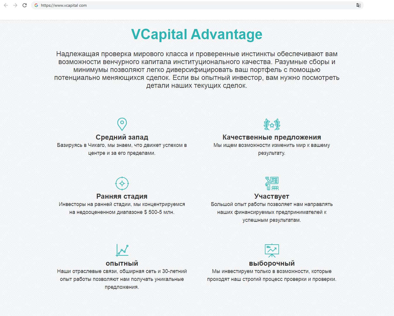 Далее компания представляет свои преимущества, которые махинаторы Advantage придумали сами. Они указывают, что надлежащая проверка мирового класса и проверенные инстинкты обеспечивают возможности венчурного капитала институционального качества, что не является правдой, так как у мошенников нет никаких проверок.