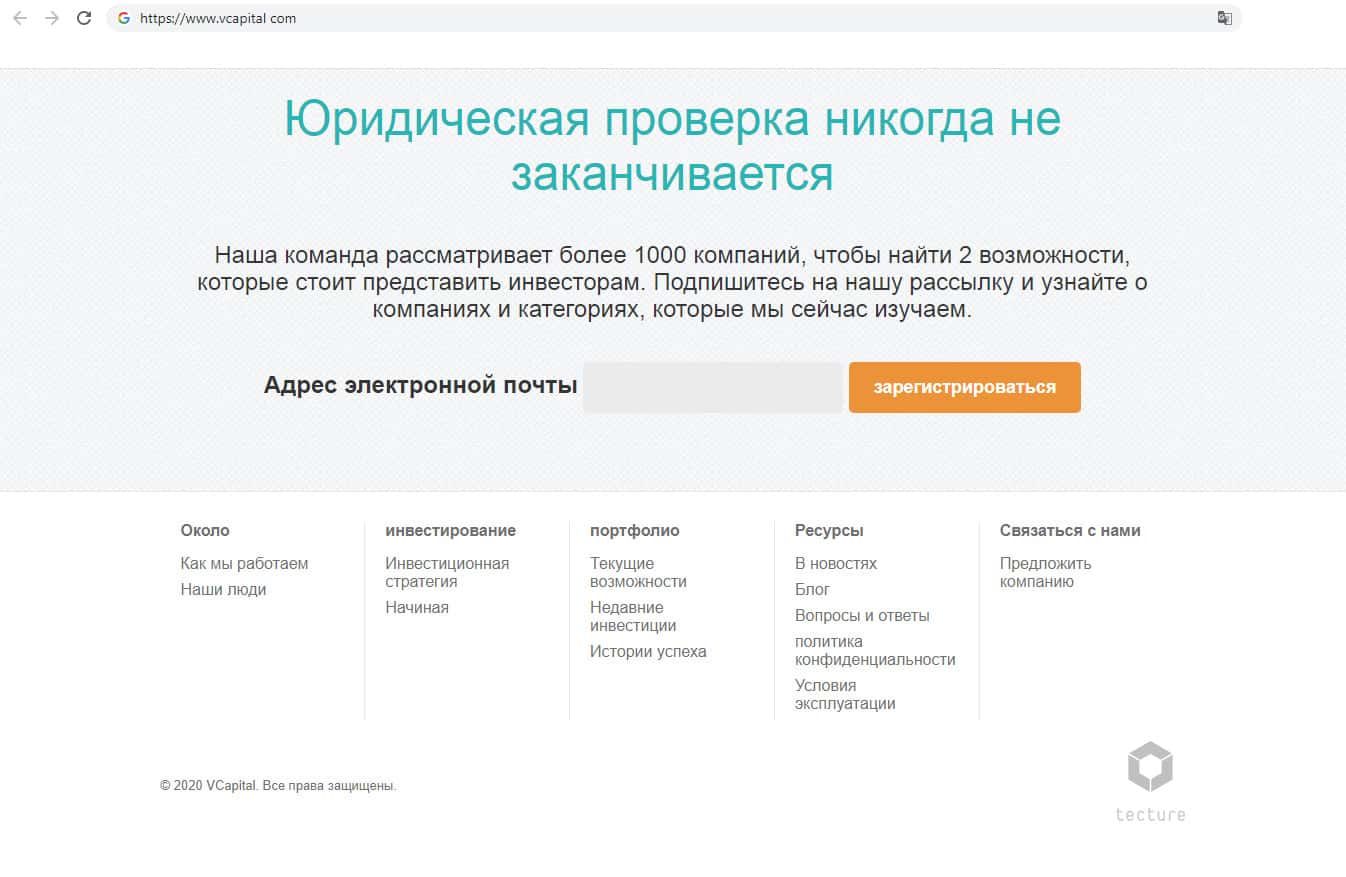 Завершает сайт аферистов VCapital раздел с информацией о каких то юридических проверках, где компания якобы из тысяч фирм выбирает несколько самых выгодных. Так же компания предоставляет ссылки на фальшивую документацию. Глядя на этот сайт сразу становится заметно мошенничество, но только опытные инвесторы способны заметить его.