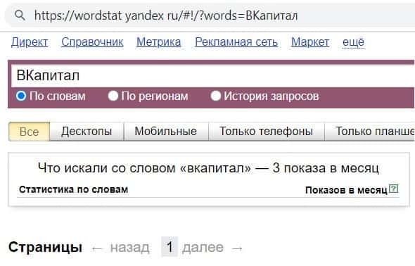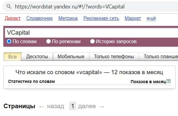 Далее мы проверили количество запросов фирмы махинаторов VCapital по русскоязычному названию компании, а именно "ВКапитал", но и этот запрос пользователи не выполняли.