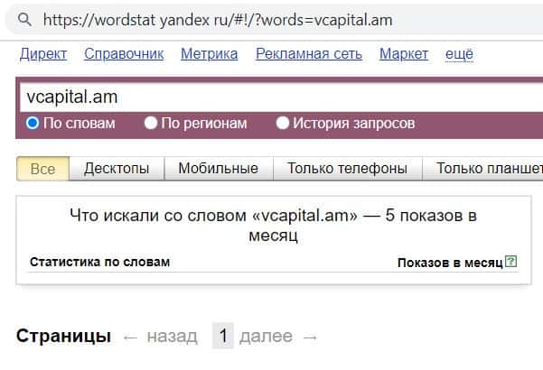 Напоследок мы проверили количество запросов финансовых разводил ВКапитал по домену конторы с точкой, а именно "vcapital.am". Данный запрос пользователи так же не выполняли.