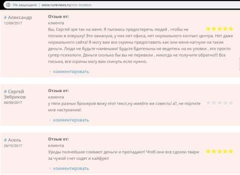 Жертва аферы специалистами VNC Brokers предостерегает остальных, что в данной конторе работаю по принципу заманухи. Сначала дают заработать, а потом выжимают из вас все до последнего. Если вам звонят с ВНС Брокерс Артуры, Александры и прочие мошенники, то бросайте трубку, иначе останетесь без штанов.