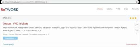 По словам следующего автора отзыва, компания VNC Brokers работает в связке с другим мошенником Trade Group Solutions. Сначала они заманивают прибыльными сделками, а потом льют депозит, схема старая но проверенная. У них работают такие звонари Артур, Алексей, Руслан и многие другие, хотя скорее всего это псевдонимы. Лохотронщики будут наказаны самим Аллахом.