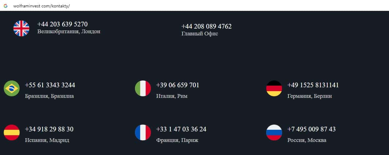 Аферисты Вольфрам Инвест на своем дырявом сайте указали несколько номеров контактного телефона, с которых навязчиво названивают потенциальным жертвам: