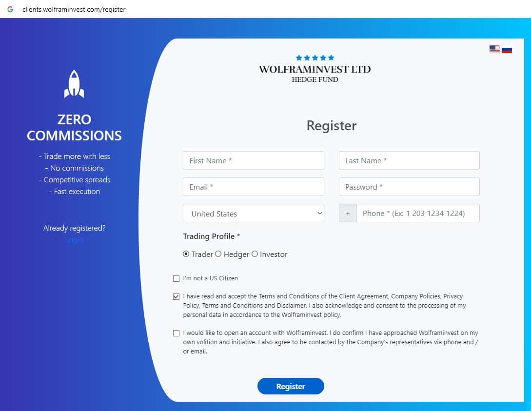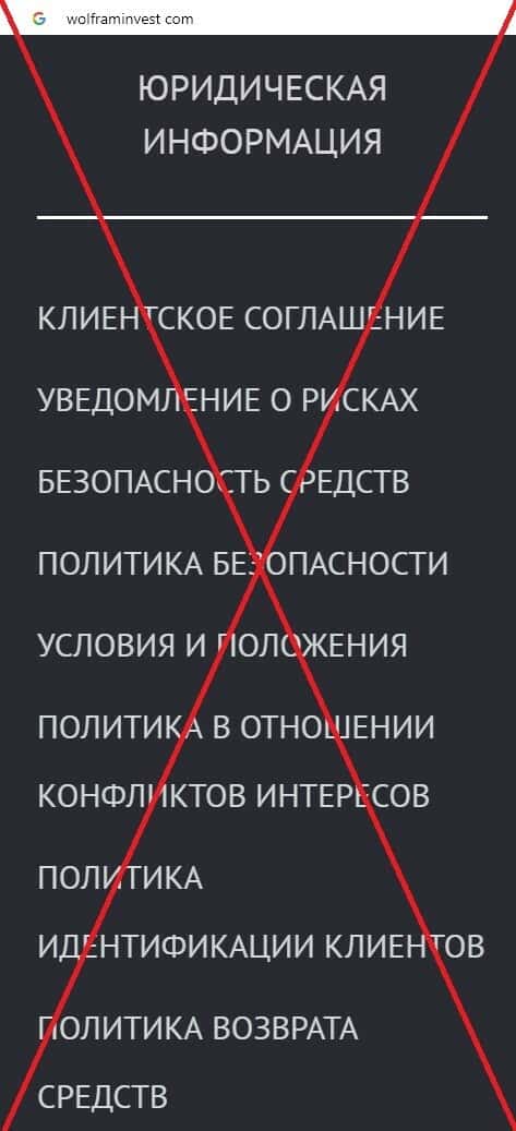 На своем интернет-портале мошенники Вольфрам Инвест не предоставили никакой информации о лицензии компании, что является признаком фальшивой компании.