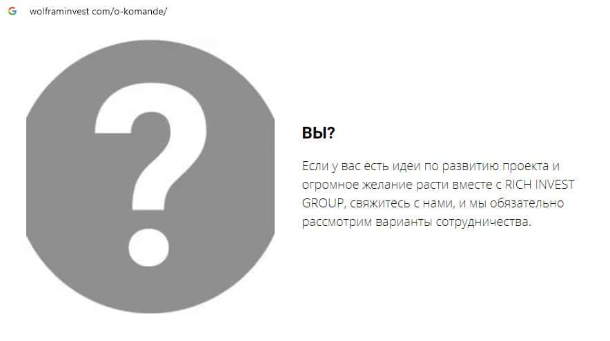 Одним из партнеров скам-брокера Вольфрам Инвест является шарага Rich Invest Group, которая действуя сообща разводит пользователей на деньги.