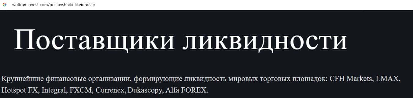 Далее предлагаем ознакомиться с данными о том, какие интернет-лохотроны псевдо-брокер WolframInvest предоставляет в качестве поставщиков ликвидности своей компании.