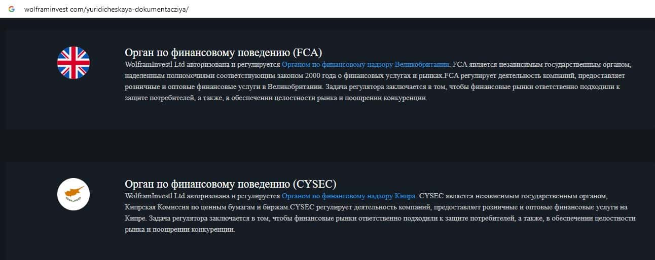 Лохотронщики WolframInvest указывают информацию о том, что деятельность конторы регулируется FCA, а также CySEC, что вероятно не правдивая информация.