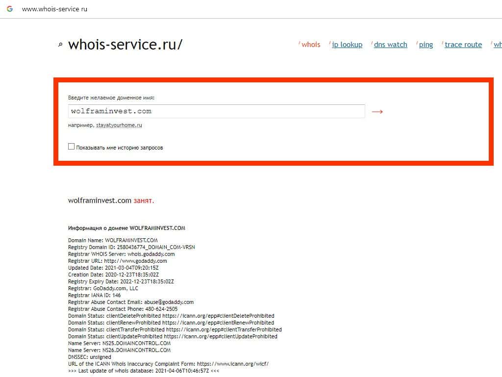 Данные о владельце домена скам-конторы WolframInvest отсутствуют