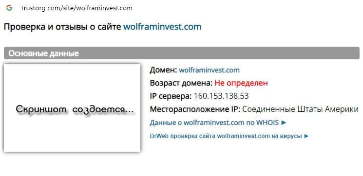 Информация о возрасте домена псевдо-брокера Вольфрам Инвест
