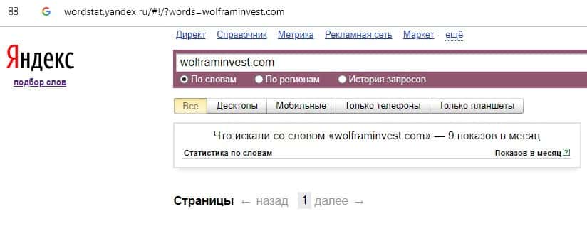 - Количество запросов по бренду WolframInvest в поисковике Яндекс
