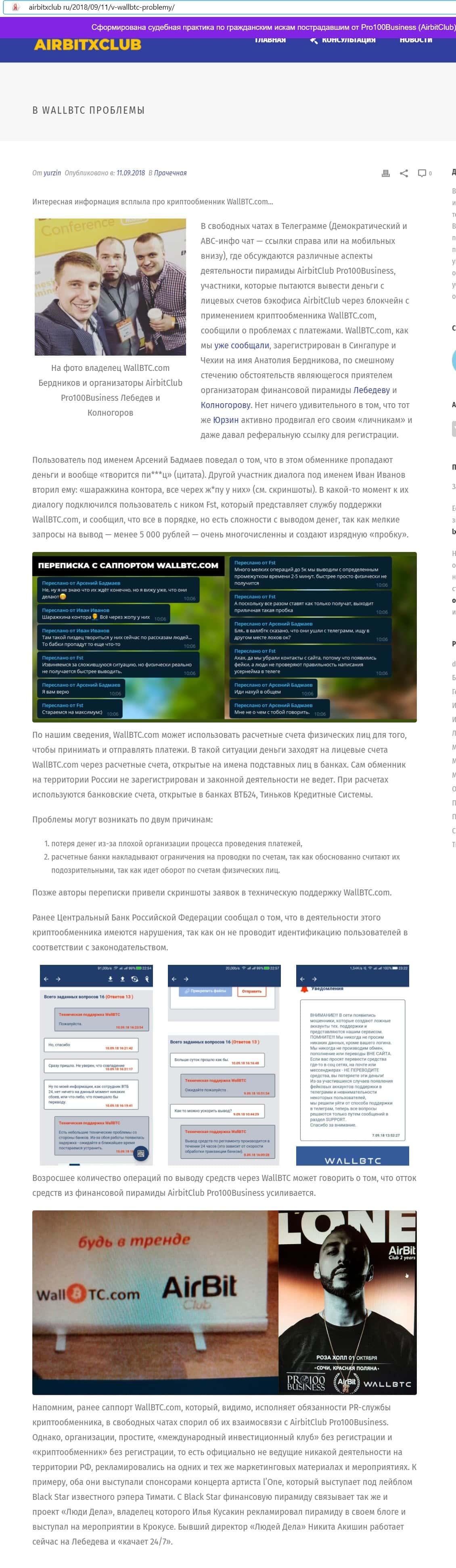 На сайте airbitxclub ru появилась статья о платежной системе WallBTC, что ее хозяином является проходимец и личный друг организаторов других лохотронов в интернете.