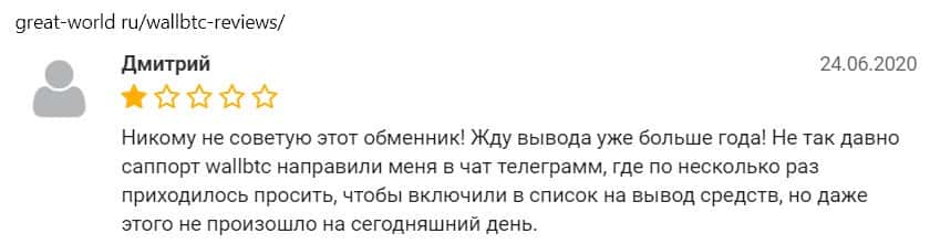 Алексей добавил отзыв, что он ждет вывода своих денег уже полгода, но это бесполезно. Обменник Волл БТЦ забирает средства у клиентов, а их оставляет с носом.