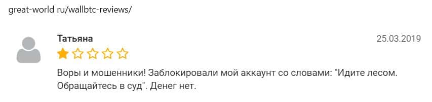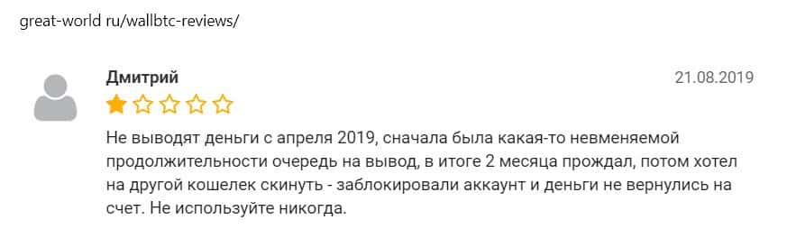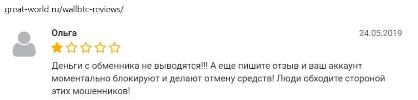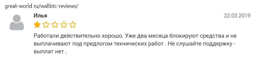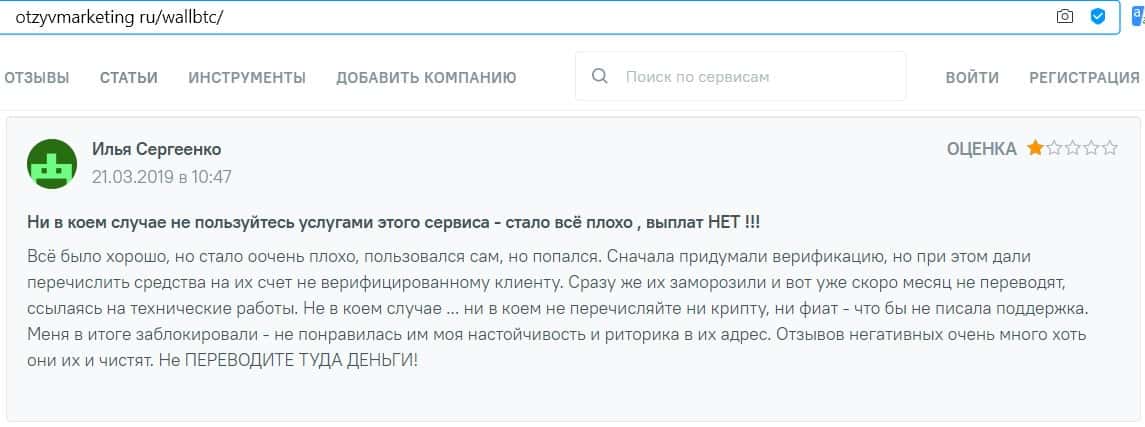 Сергей написал отзыв, что его кошелек был заблокирован после того, как он оставил отрицательный отзыв о плохой работе платежной системы Волл БТЦ.
