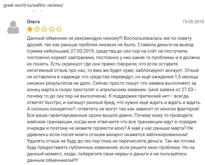 Ольга написала длинный комментарий о том, что деньги с сайта Волл БТЦ не выводят, поддержка неадекватная. Девушка не рекомендует никому попасть на эту площадку.