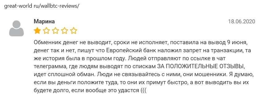Марина пишет, что Волл БТЦ - жулики, они выводят деньги только за положительные отзывы по спискам. Ее заявку на вывод отклоняют, придумывают какую-то ересь.