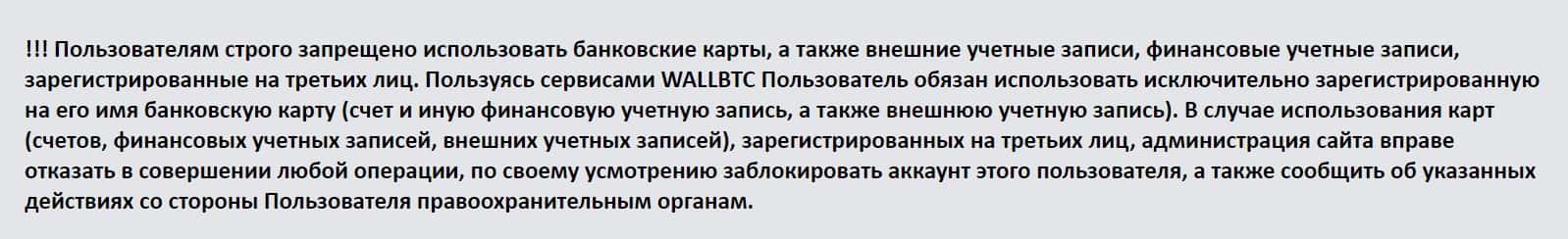 Компания WallBTC сообщает пользователям, что их банковские карты должны быть зарегистрированы строго на них, в ином случае они будут заблокированы системой.