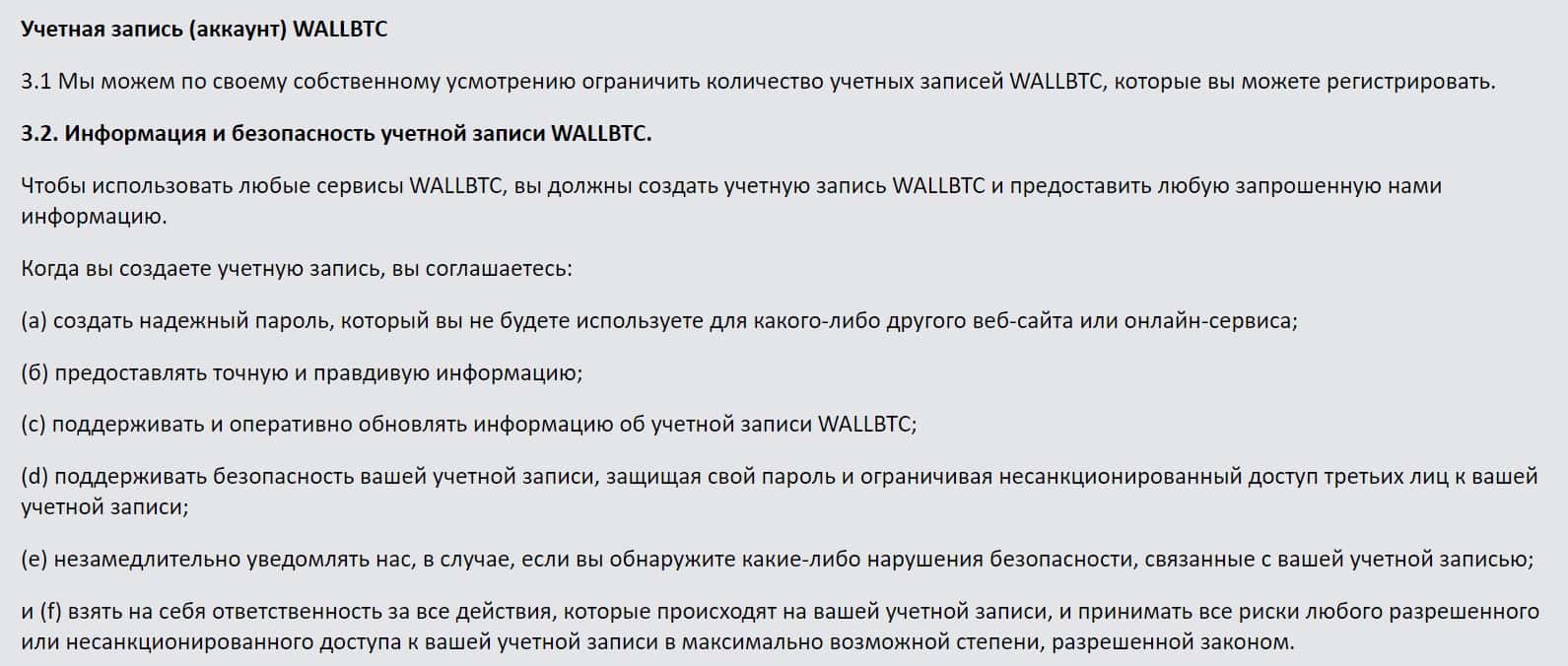 Раздел об учетной записи пользователя говорит, что администрация сайта WallBTC может ограничить количество его аккаунтов по своему желанию.